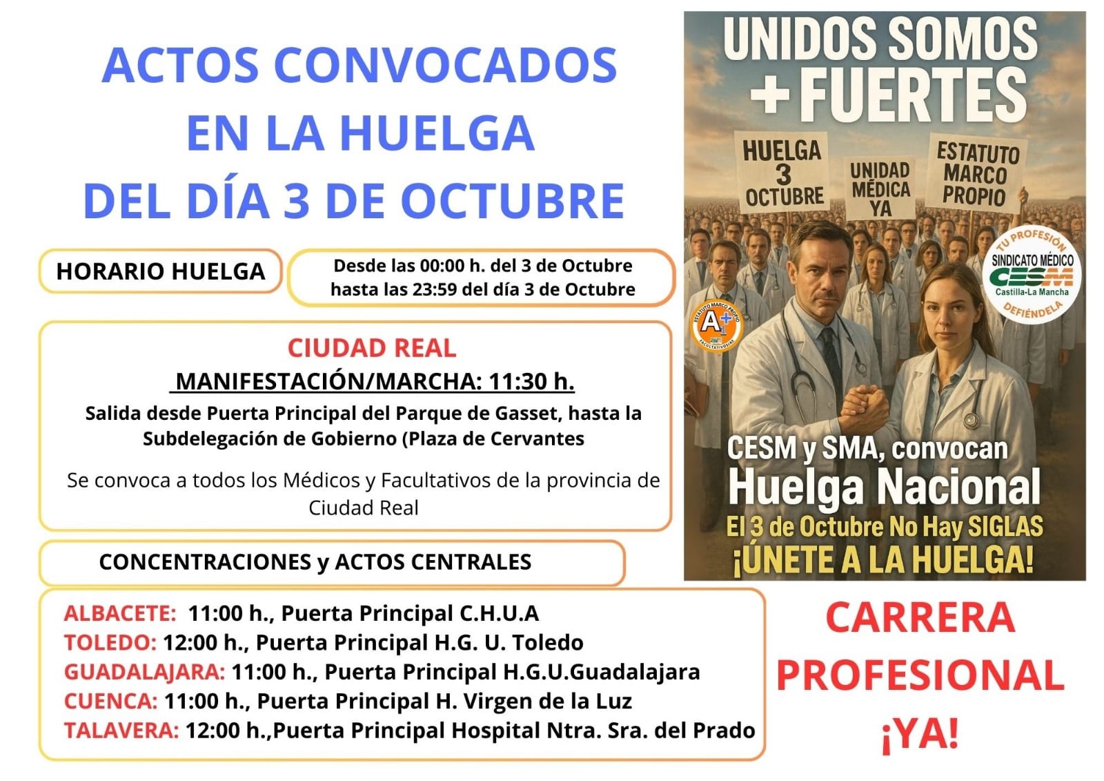 Actos Convocados CESMCLM Huelga 3 Octubre CESM Castilla-La Mancha anuncia los siguientes actos convocados en las distintas provincias de Castilla La Mancha ante la Huelga Nacional de Médicos y Facultativos del próximo 3 de octubre. El Sindicato Médico CESM, junto al Sindicato Médico Andaluz (SMA), ha convocado una huelga nacional de médicos y facultativos