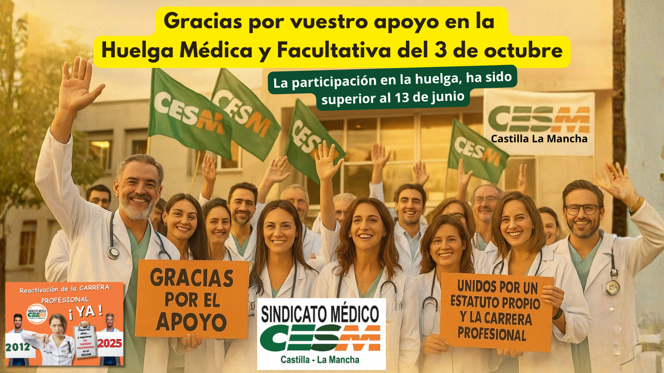 Hoy, 3 de octubre de 2025, el Sindicato Médico de Castilla-La Mancha expresa su más sincero agradecimiento a todos los profesionales: Médicos, Facultativos, Residentes y Estudiantes de Medicina que, con su participación, han hecho posible la jornada de huelga médica y facultativa en nuestra región. Así mismo, damos las gracias a los pacientes y ciudadanos