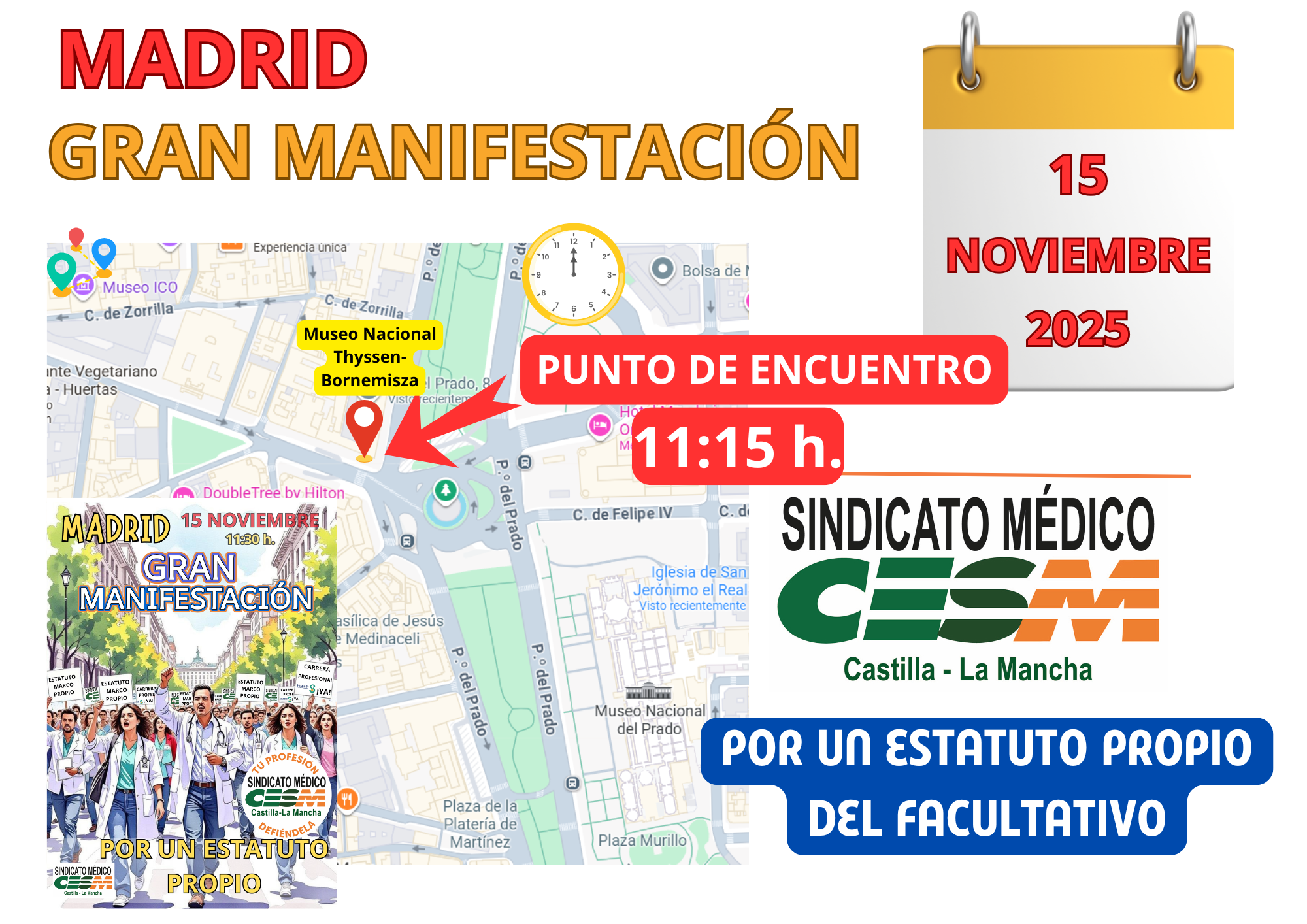 Gran Manifestación 15 Noviembre en Madrid por un Estatuto Propio para nuestra. Punto de encuentro de Castilla-La Mancha: 11:15 h frente al Museo Nacional Thyssen-Bornemisza El próximo sábado 15 de noviembre, Médicos, Facultativos, Residentes y Estudiantes de Medicina de toda España nos reuniremos en Madrid para alzar la voz por una causa justa y urgente: