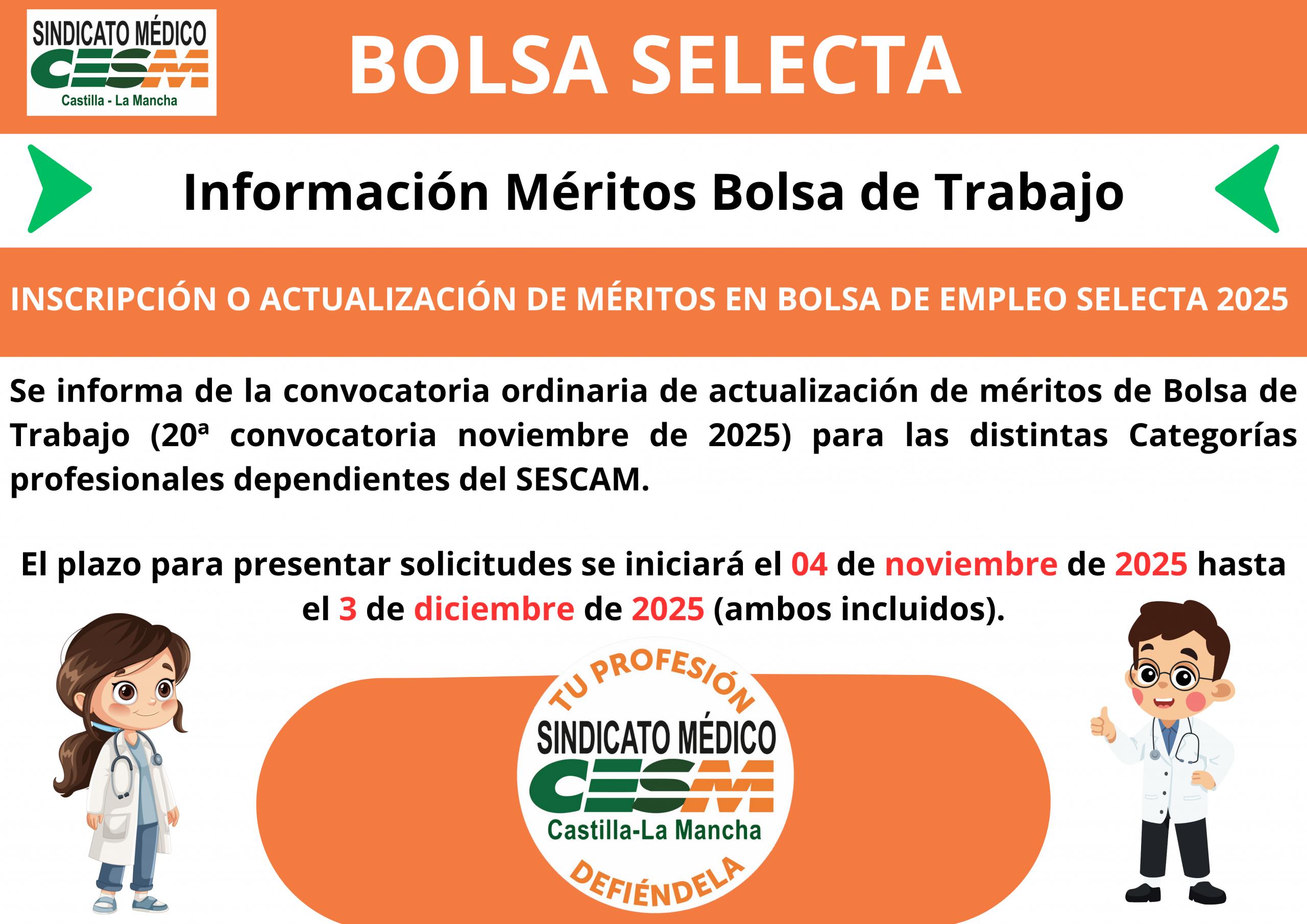 Convocatoria ordinaria de actualización de méritos de Bolsa de Trabajo (20ª convocatoria noviembre de 2025) para las distintas Categorías profesionales dependientes del SESCAM. El plazo para presentar solicitudes se iniciará el 04 de noviembre de 2025 hasta el 3 de diciembre de 2025 (ambos incluidos).