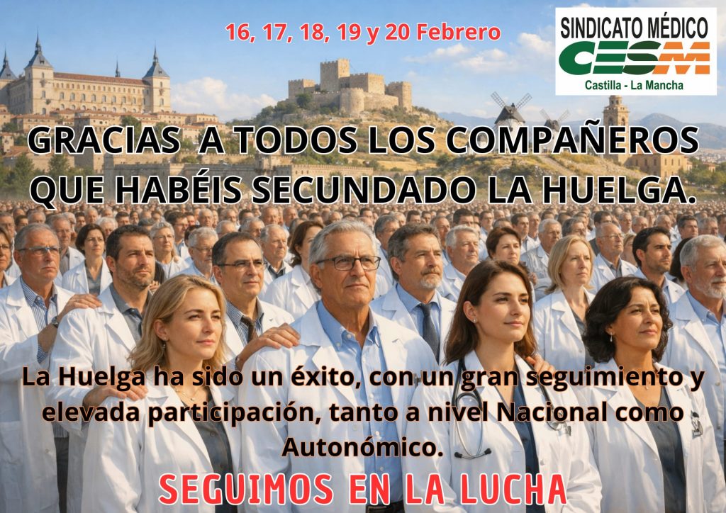 Desde el Sindicato Médico de Castilla-La Mancha (CESM CLM) valoramos muy positivamente el seguimiento de la huelga médica y facultativa desarrollada la semana pasada en Castilla-La Mancha, con una participación muy elevada que refleja el respaldo mayoritario de los profesionales.